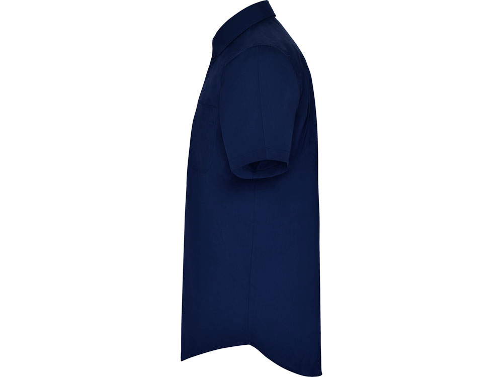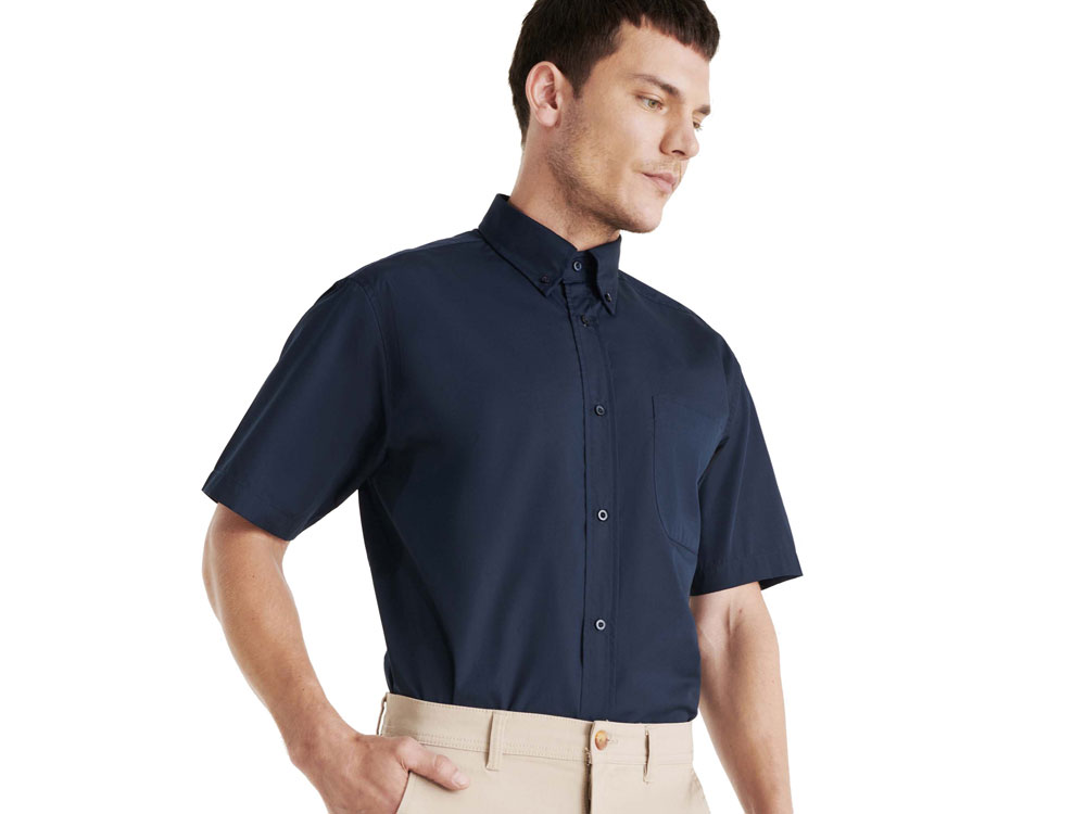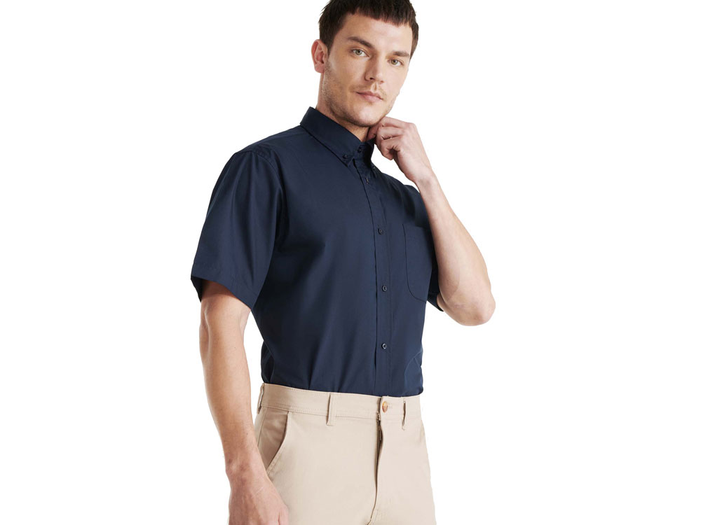 Рубашка мужская с коротким рукавом на семи пуговицах. Накладной карман на груди слева, закругленный низ изделия. Уголки воротника продублированы пуговицами. В ассортименте представлена аналогичная женская модель рубашки Aifos.