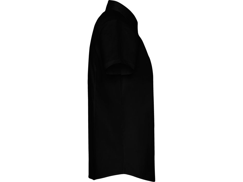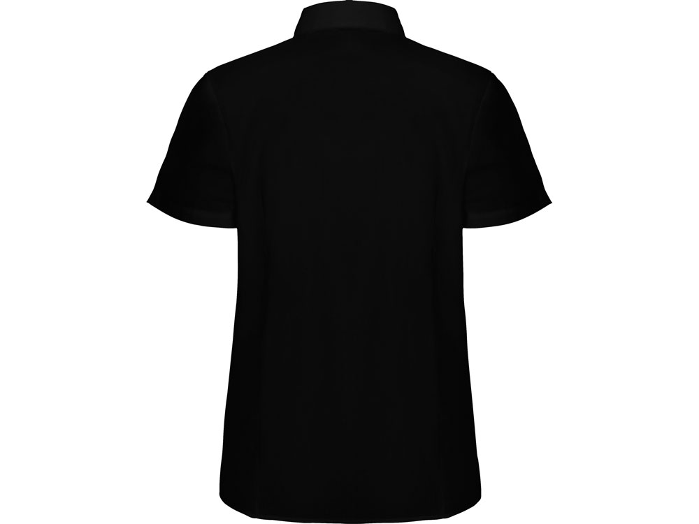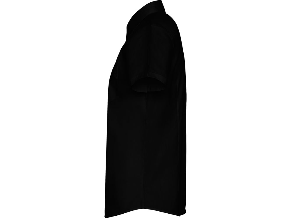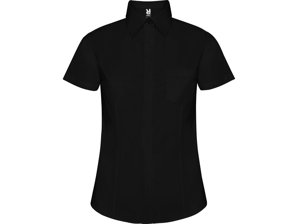 Рубашка женская прилегающего силуэта с вытачками на полочке и спинке с коротким рукавом. Накладной карман на груди слева, закругленный низ изделия. Планка с потайными пуговицами.