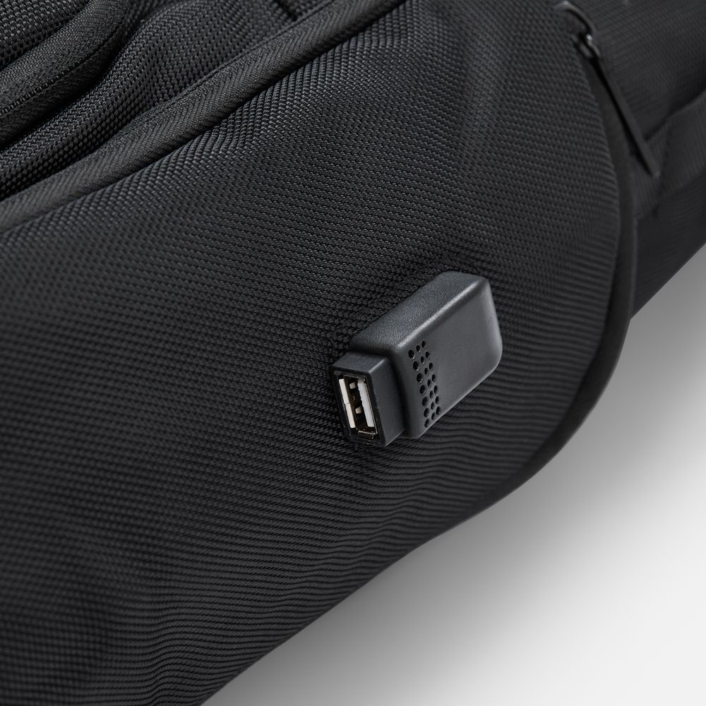 Специально для вещей, которые должны быть всегда под рукой, предусмотрен накладной карман с фиксацией по бокам. А благодаря внешнему USB-порту можно заряжать смартфоны, планшеты и другие устройства прямо на ходу.