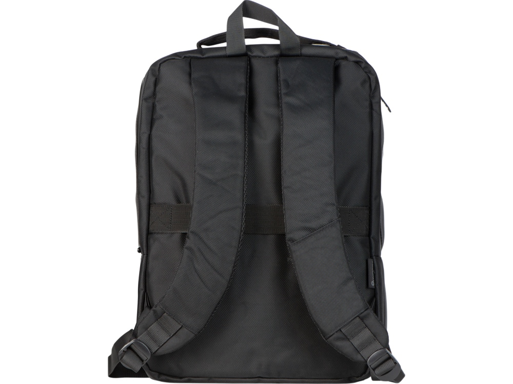 Удобный бизнес-рюкзак для передвижения по городу и деловых поездок состоит из отделения для ноутбука и планшета, большого отделения для одежды с фиксирующими ремнями, 2х наружных карманов на молнии спереди. Конструкция рюкзака продумана до мелочей: внутри большого отделения расположен органайзер для гаджетов и проводов, на спинке есть ремень для крепления на ручку чемодана и регулирующиеся по длине лямки, на лямке - карман для карт или ключей. Водостойкий материал и молнии. В комплекте мешок из спанбонда для хранения и металлический шильд под ваш логотип.