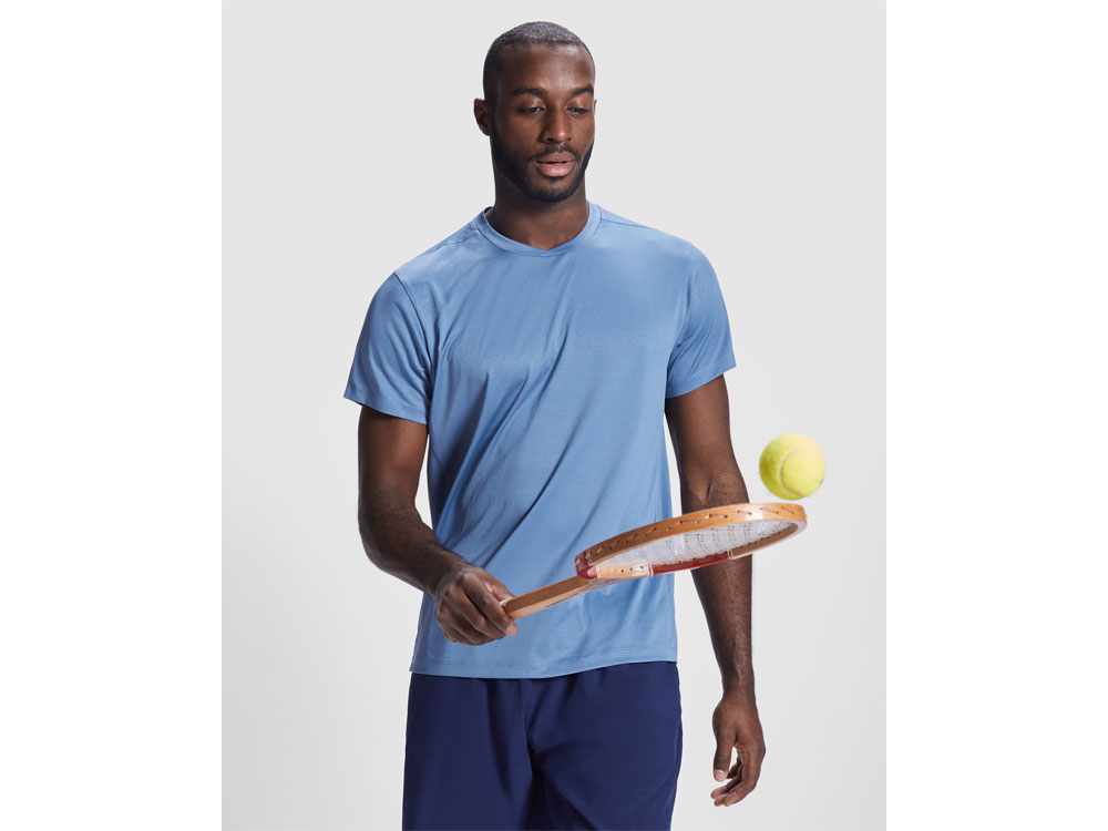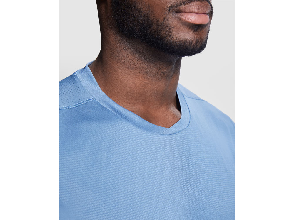 Мужская технологическая футболка с короткими рукавами. Легкая ткань из переработанного полиэстера. · Воротник с перекрещенными деталями. · Кокетка сзади и рукава из дышащей ткани. · Направленные вперед и наклонные швы по бокам и плечам. · Комбинация дышащих и эластичных тканей.