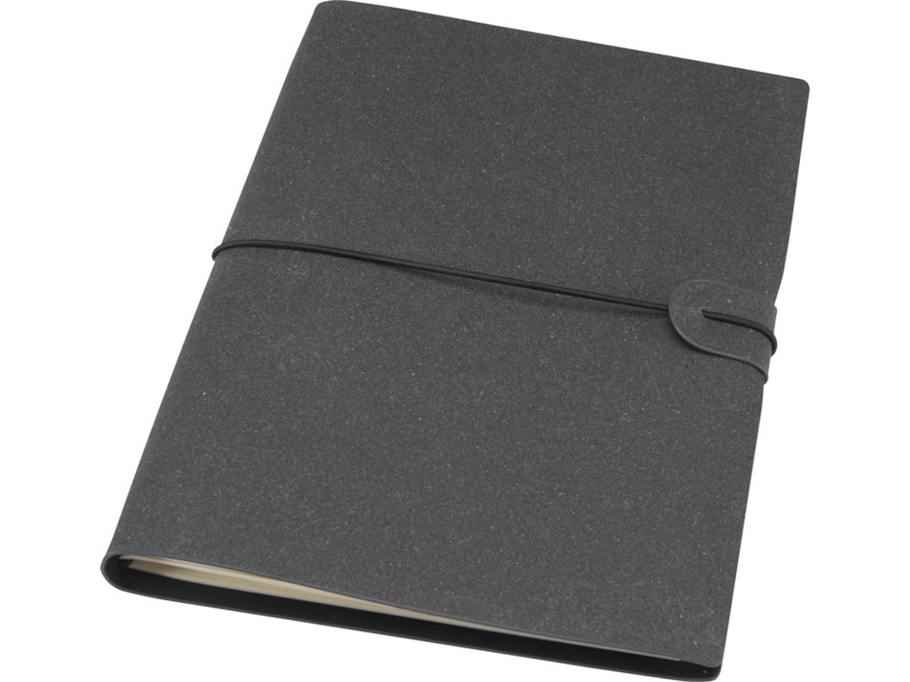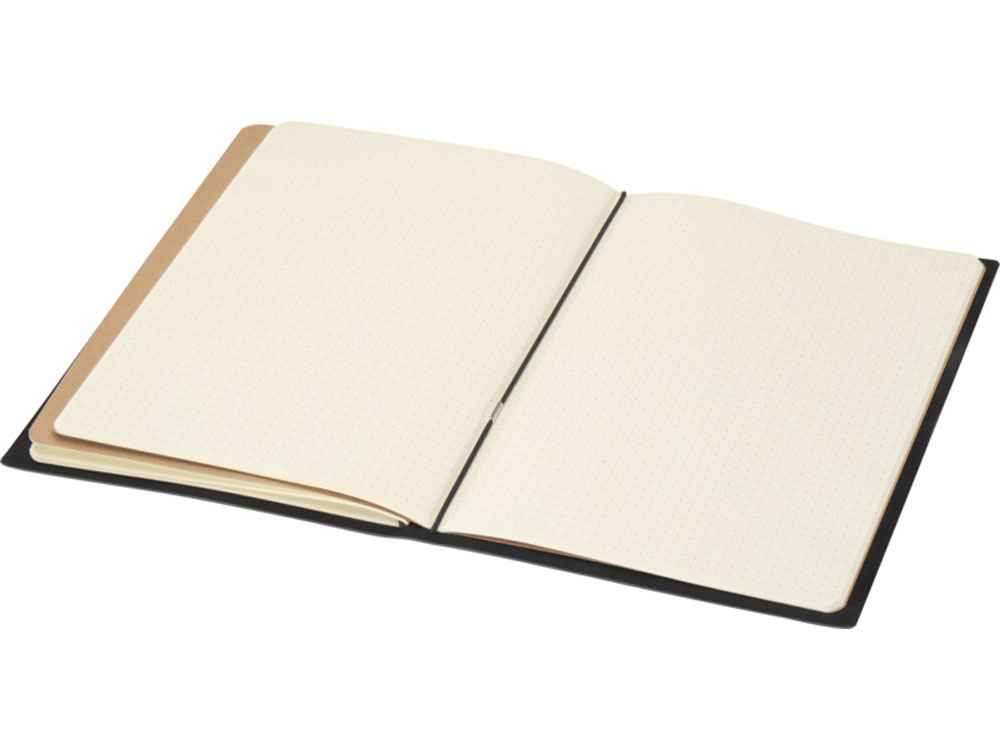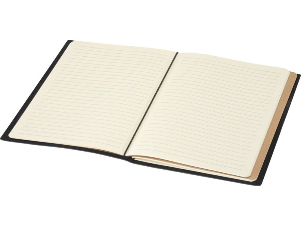 Блокнот Slyk со сменными блоками формата A5 имеет обложку из переработанной пластмассы с эластичной застежкой, которая надежно удерживает два внутренних блока: один с листами в точку, второй - в линейку. Каждый блок имеет 32 листа кремового цвета, изготовленных из бумаги плотностью 70 г/м², с закругленными углами и швами на корешке, что создает впечатление ручной работы. Обложки блоков изготовлены из картона. Сменные блоки доступны под заказ отдельно в различных вариантах оформления, включая листы в точку, листы в линию и листы для планирования дел.