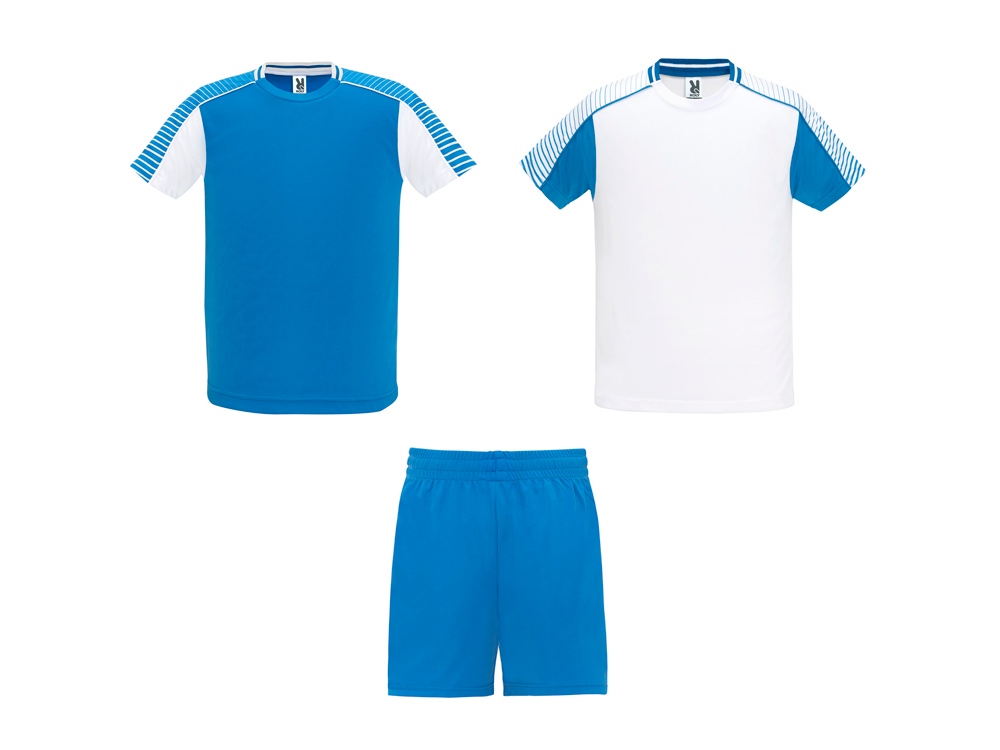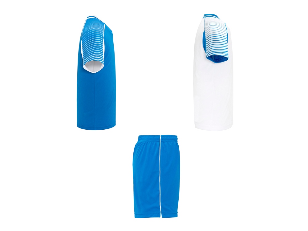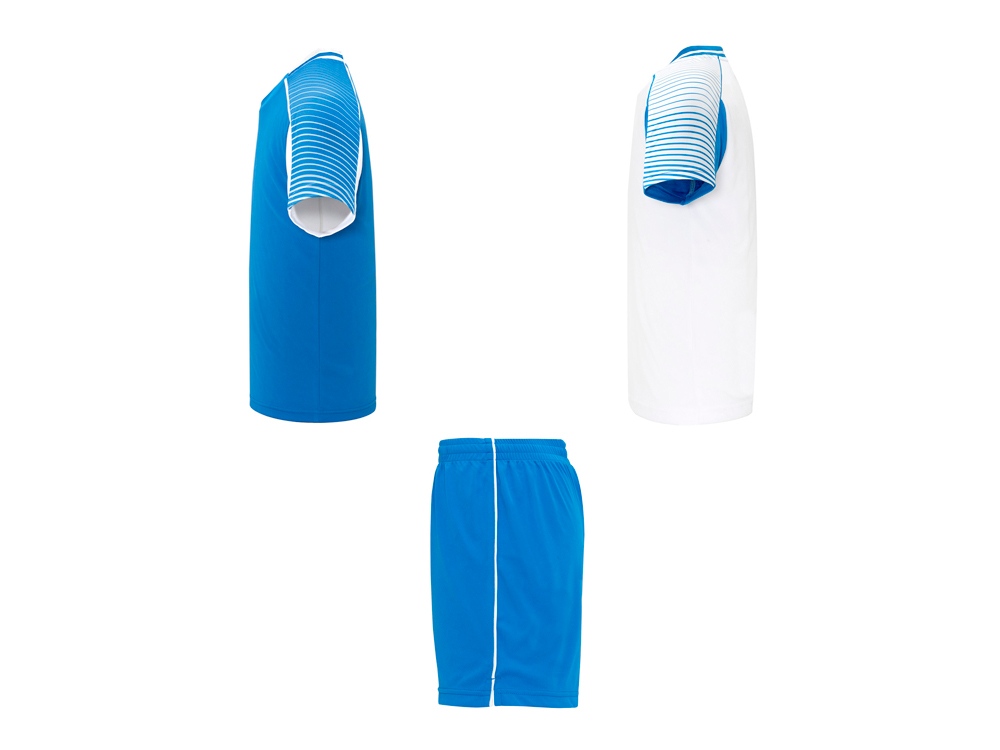 Спортивный костюм унисекс: две футболки и одни шорты. - Футболки с принтованными рукавами полуреглан. - Круглая горловина, из трикотажной ткани сзади. - Цвет второй футболки — полностью противоположный первой. - Шорты с эластичным поясом с внутренним шнурком в тон и усиленной строчкой. - Лампасы по бокам и боковые разрезы снизу штанин.