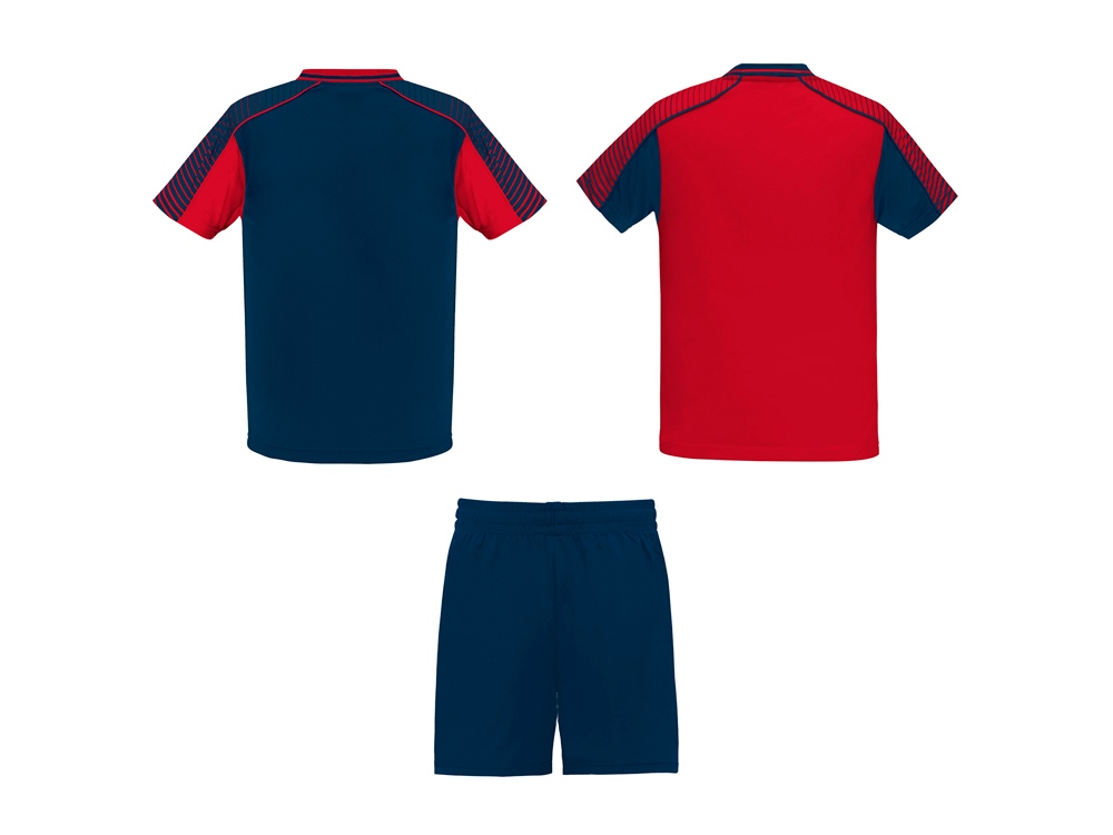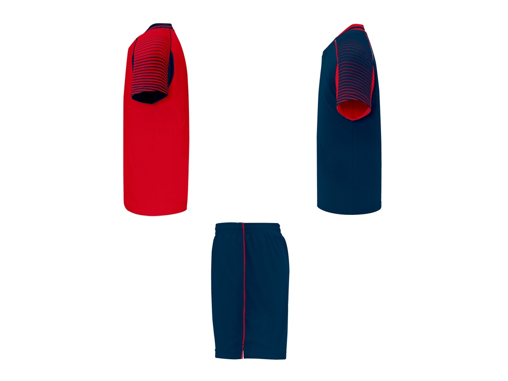Спортивный костюм унисекс: две футболки и одни шорты. - Футболки с принтованными рукавами полуреглан. - Круглая горловина, из трикотажной ткани сзади. - Цвет второй футболки — полностью противоположный первой. - Шорты с эластичным поясом с внутренним шнурком в тон и усиленной строчкой. - Лампасы по бокам и боковые разрезы снизу штанин.