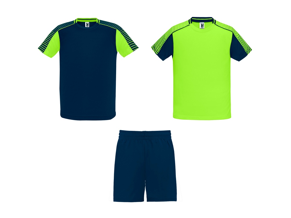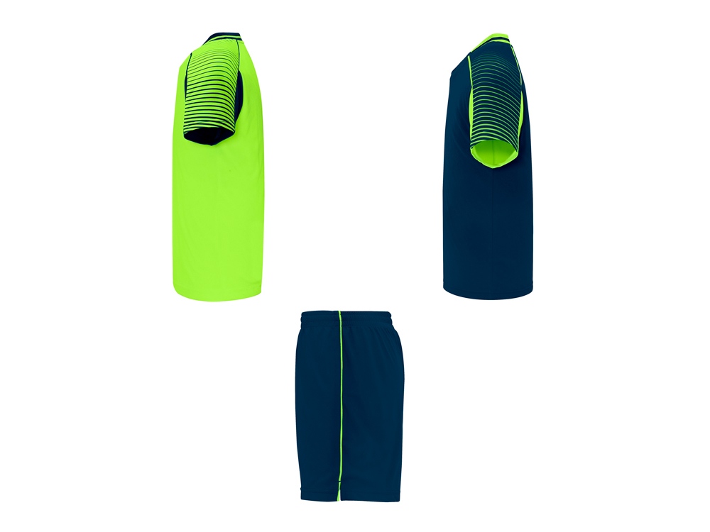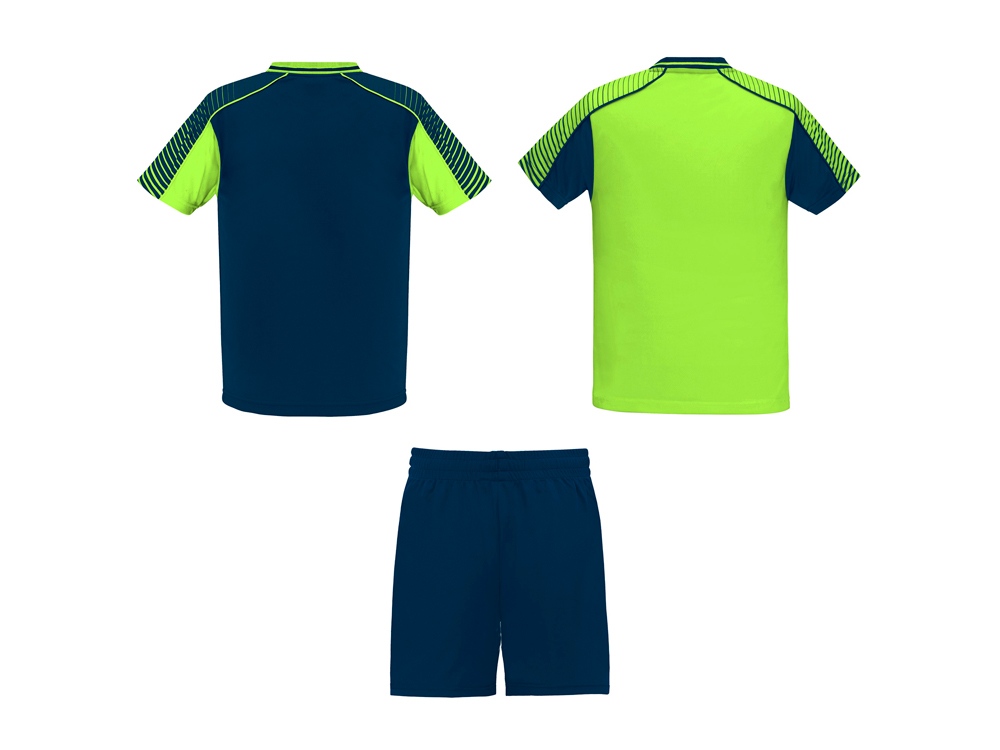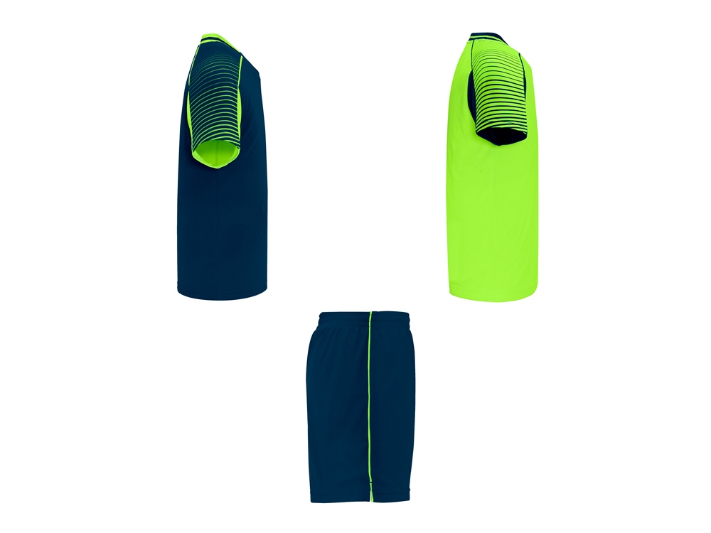 Спортивный костюм унисекс: две футболки и одни шорты. - Футболки с принтованными рукавами полуреглан. - Круглая горловина, из трикотажной ткани сзади. - Цвет второй футболки — полностью противоположный первой. - Шорты с эластичным поясом с внутренним шнурком в тон и усиленной строчкой. - Лампасы по бокам и боковые разрезы снизу штанин.