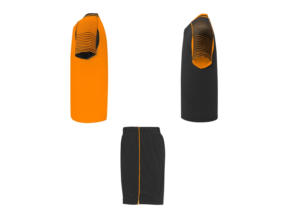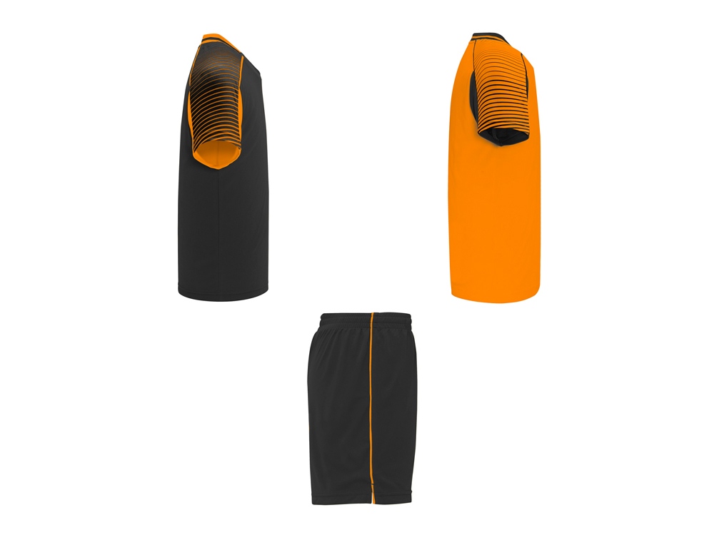 Спортивный костюм унисекс: две футболки и одни шорты. - Футболки с принтованными рукавами полуреглан. - Круглая горловина, из трикотажной ткани сзади. - Цвет второй футболки — полностью противоположный первой. - Шорты с эластичным поясом с внутренним шнурком в тон и усиленной строчкой. - Лампасы по бокам и боковые разрезы снизу штанин.