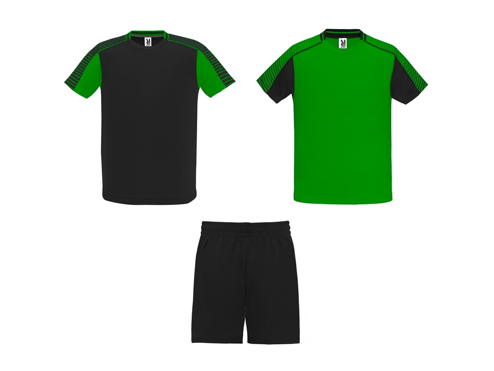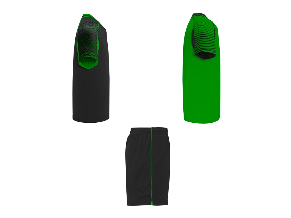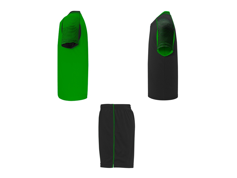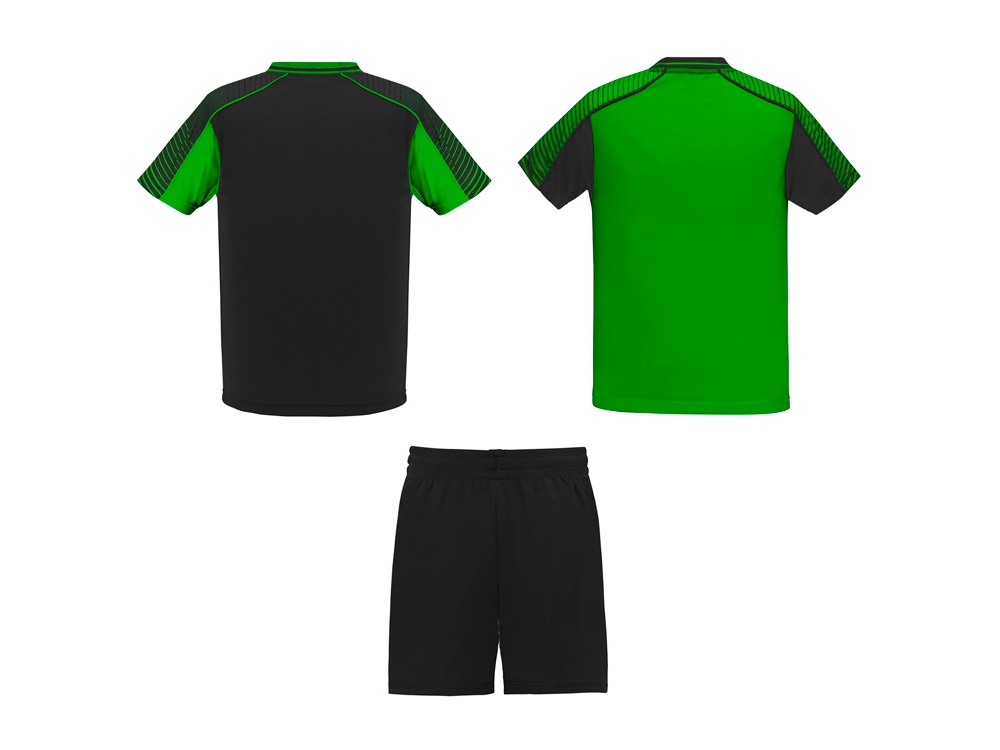 Спортивный костюм унисекс: две футболки и одни шорты. - Футболки с принтованными рукавами полуреглан. - Круглая горловина, из трикотажной ткани сзади. - Цвет второй футболки — полностью противоположный первой. - Шорты с эластичным поясом с внутренним шнурком в тон и усиленной строчкой. - Лампасы по бокам и боковые разрезы снизу штанин.