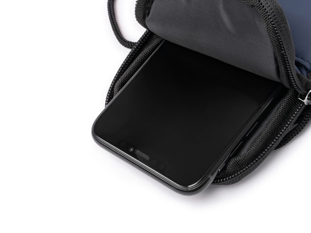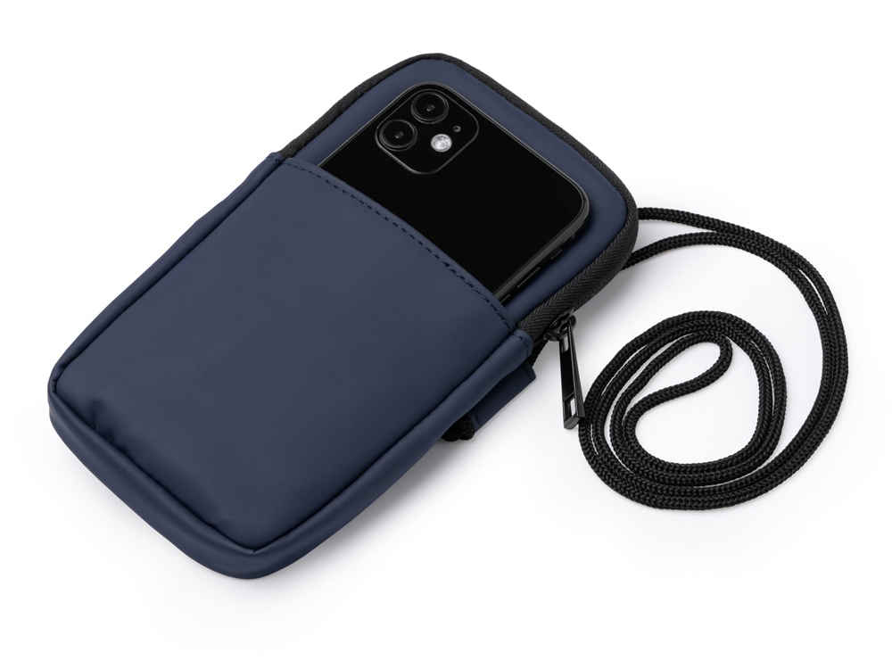 Сумка для мобильного телефона из искусственной кожи. Основное отделение закрывается на молнию. Внешний карман и регулируемый ремешок для переноски.