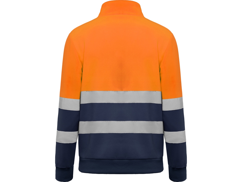 Свитшот с воротом на молнии, предназначен для использования в условиях плохой видимости. Внутри воротника отстрочка для усиления. Горизонтальные полоски со светоотражением на груди и рукавах. Манжеты и низ из рибовой ткани 1х1.