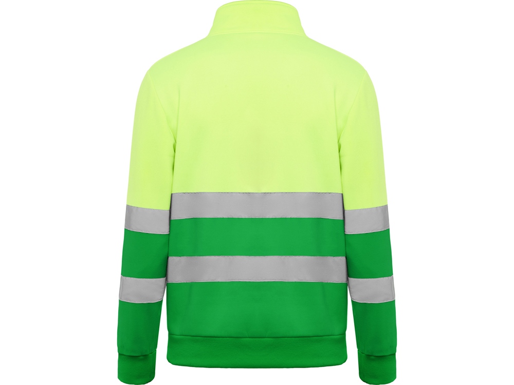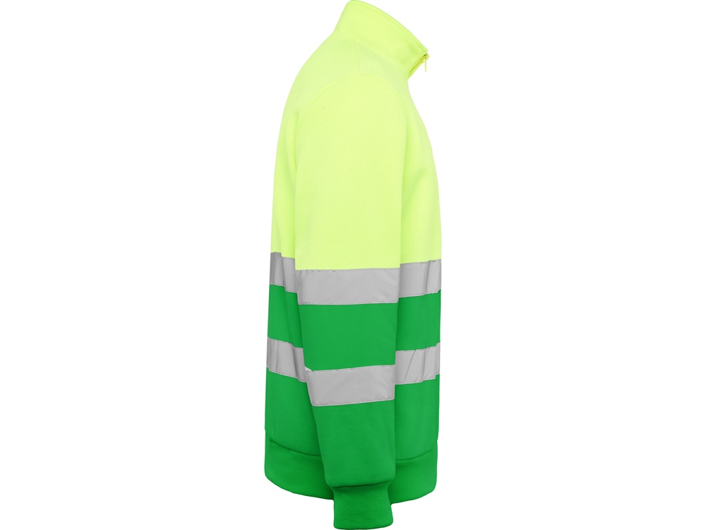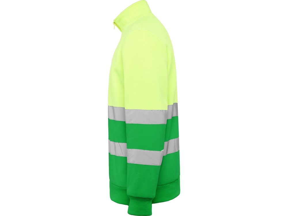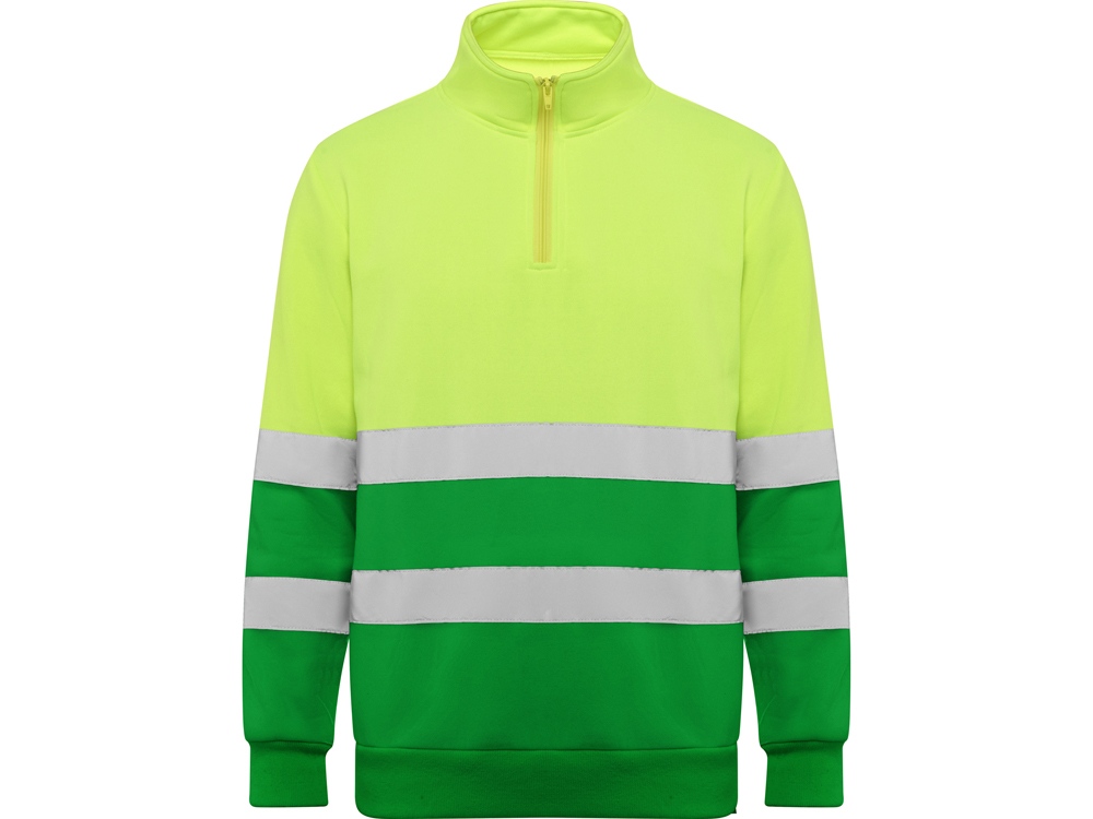 Свитшот с воротом на молнии, предназначен для использования в условиях плохой видимости. Внутри воротника отстрочка для усиления. Горизонтальные полоски со светоотражением на груди и рукавах. Манжеты и низ из рибовой ткани 1х1.