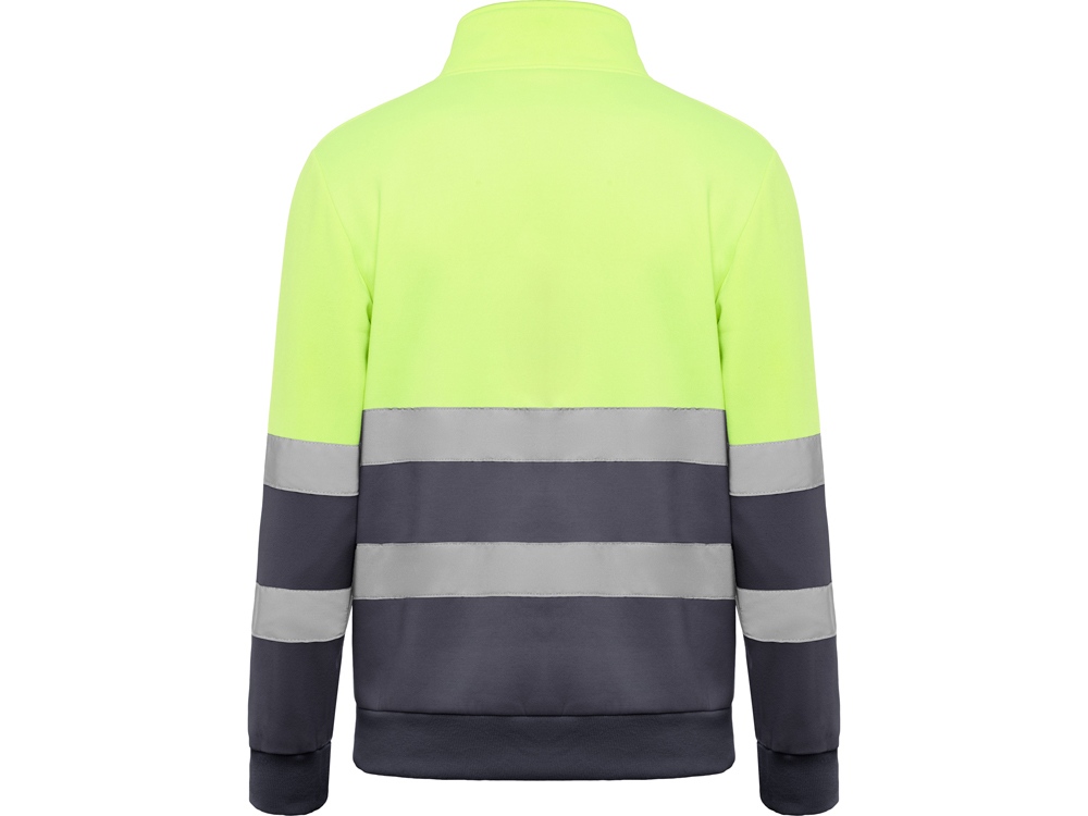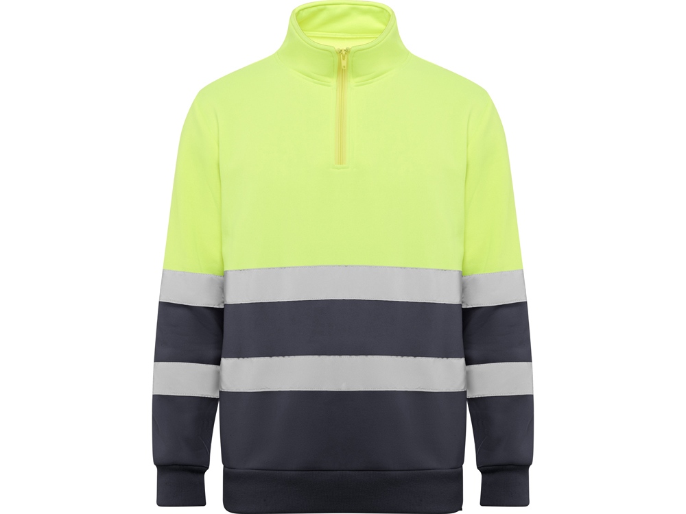 Свитшот с воротом на молнии, предназначен для использования в условиях плохой видимости. Внутри воротника отстрочка для усиления. Горизонтальные полоски со светоотражением на груди и рукавах. Манжеты и низ из рибовой ткани 1х1.