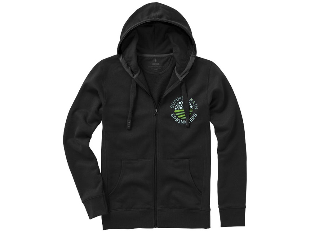 Толстовка Арора с капюшоном и застежкой-молнией на всю длину. Стандартный покрой. Резинка 2х2 на боковых вставках, поясе и манжетах. Карман кенгуру. Мужская и женская модели с завязками на капюшоне. Подкладка внутри капюшона и на спинке под горловиной в форме полумесяце. Атласная лента для укрепления внутри горловины. Принт лого сзади в тон изделия. Серебристые люверсы с лого. Трикотаж: 82% хлопок, 10% вискоза и 8% полиэстер, чесаная внутренняя сторона. 300 г/м².