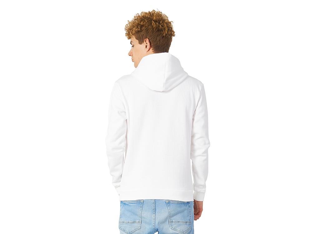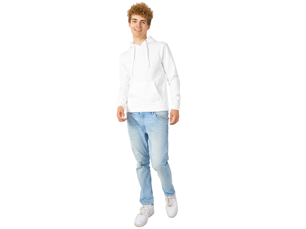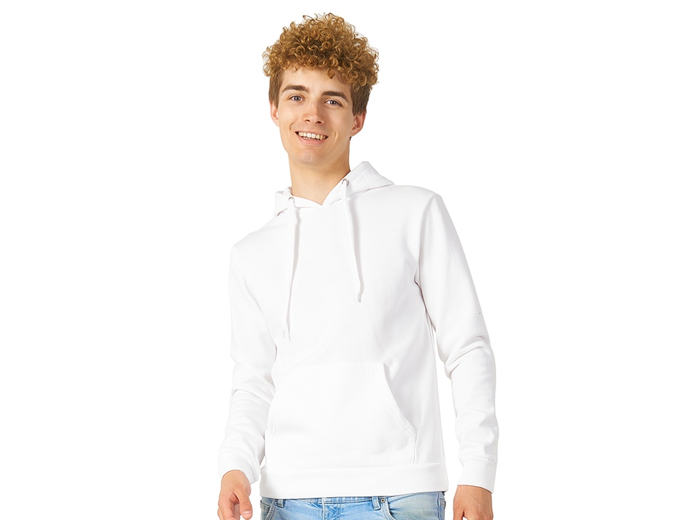 Толстовка с капюшоном (худи) из плотного футера с мягким начесом, с небольшим добавлением полиэстера. Удобная и практичная модель, подходит для прогулок по городу, активного отдыха, путешествий. • Прямой силуэт. • Капюшон с подкладкой в цвет основного материала, металлическими люверсами и плоским шнурком с наконечниками. • Удобный карман-кенгуру. • Долго сохраняет форму и не мнется благодаря небольшому содержанию полиэстера. • Гигроскопичное волокно, обладает хорошими гигиеническими свойствами. • Низ толстовки, рукавов и горловины обработаны рибом (резинкой) 1x1.