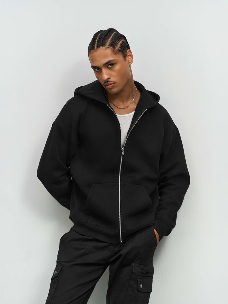 Толстовка на молнии свободной посадки. Благодаря высокой плотности изделие хорошо держит форму, а изнанка с начесом обеспечивает тепло и комфорт.