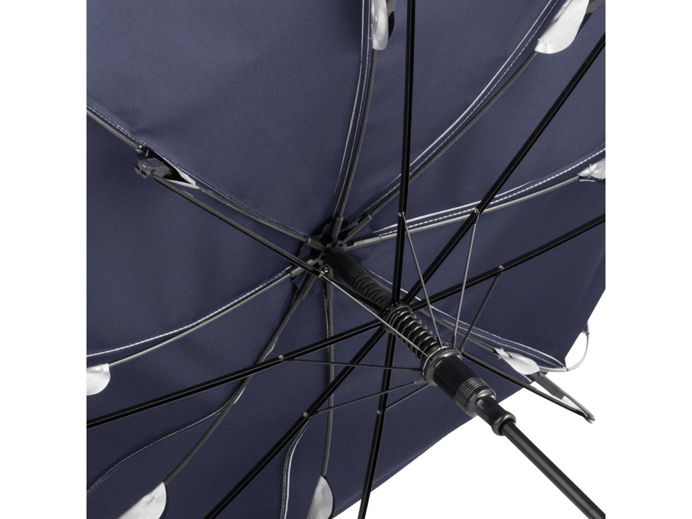 Двухцветный купол этого зонта-трости делает его ярким аксессуаром. Плавно открывается нажатием кнопки на ручке. Каркас из особо прочной гальванизированной стали.
