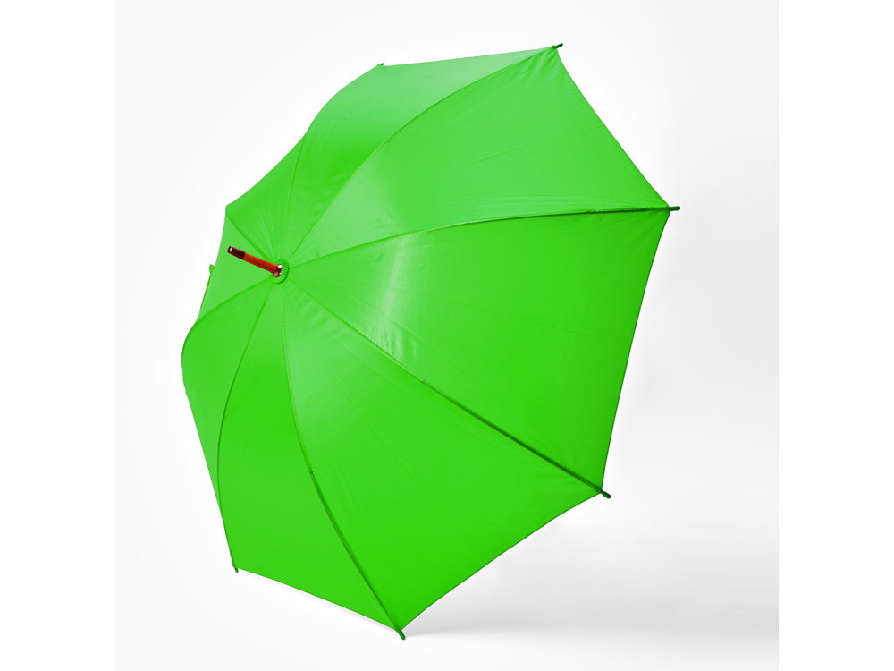 Механический зонт с ручкой, стержнем и наконечниками из дерева. Спицы черного цвета. Застежка-липучка в тон. 105 см в диаметре.